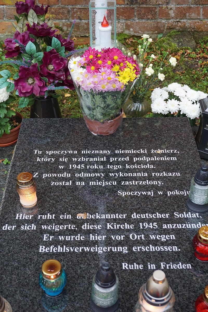 Auf einem kleinen Grabschildchen heißt es: "Nieznany żołnierz niemiecki rozstrzelany przez swoich dlatego że niech ciał podpalic koscioła" was nach meiner Übersetzung heißen müsste "Unbekannter deutscher Soldat von den Seinen erschossen weil er die Kirche nicht in Brand stecken wollte".