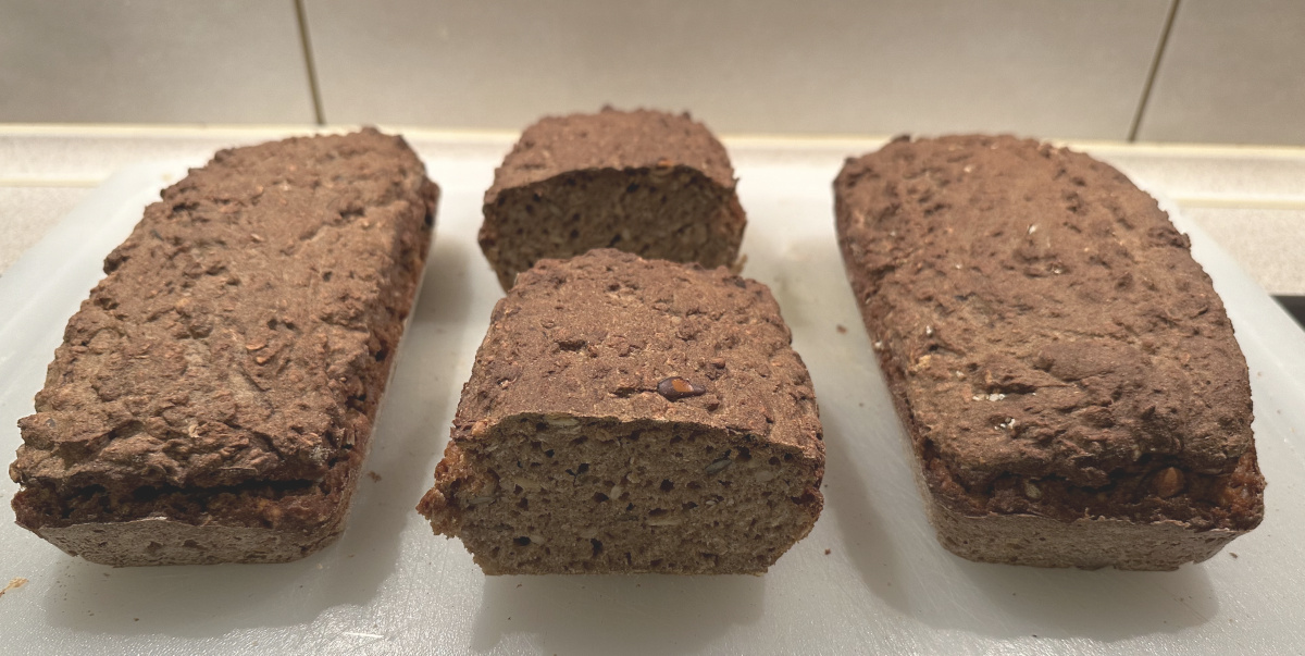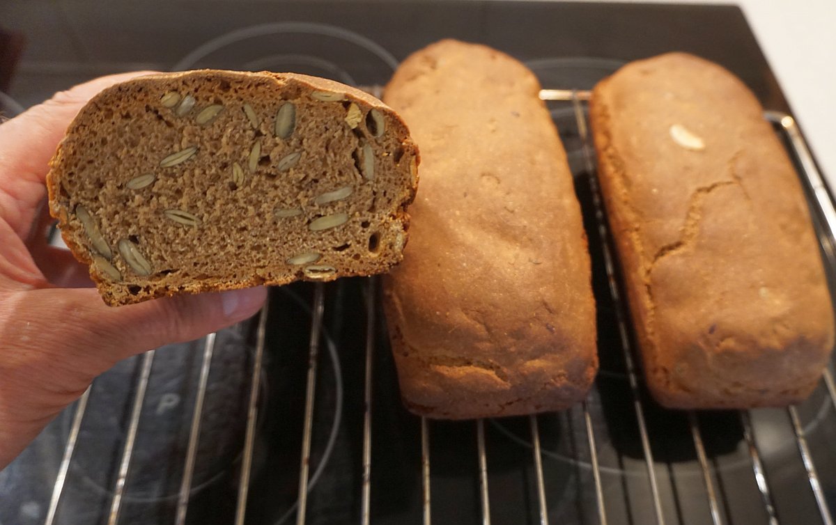nach langer Zeit habe ich heute wieder mal wieder Vollkornbrot gebacken. Drei Laibe zu je ca. 750 Gramm. Vor einer halben Stunde aus dem Backofen geholt.