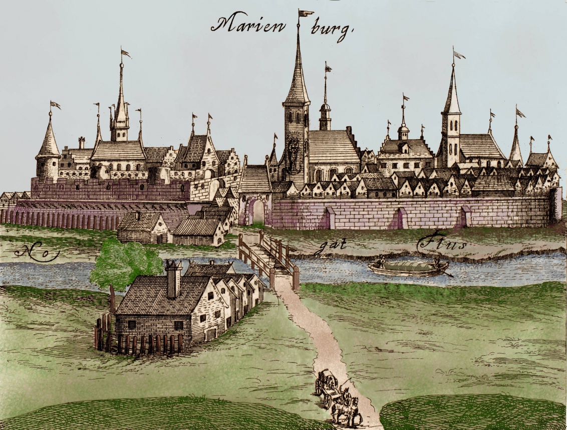 Die Marienburg war anfangs eine einfache Festung, welche von dem deutschen Orden, gegen die Einfälle der Polen und Lithauer, während der Jahre 1271 bis 1274 angelegt, und im Jahre 1276 vollendet worden war, sie war der Schutzheiligen des Ordens, der Jungfrau Maria gewidmet. Erst im Jahre 1306 wurde der Bau der eigentlichen Hochburg begonnen, und konnte schon 1309 vollendet werden, worauf der damalige Hochmeister Siegfried von Feuchtwangen, seinen Sitz hierher verlegte. In den Jahren 1335 bis 1341 wurde die ursprüngliche alte Vorburg erweitert und befestigt; das Hoch- und Mittelschloss erhielt jetzt eine feste Umwallung, befestigte Gräben und Wehrtürme, so dass aus der Marienburg nun eine sehr feste Landesburg geworden war. Winrich von Kniprode (1351-1382) legte in der Marienburg eine hohe Schule an, wo die Ritter unterrichtet wurden. Im Jahre 1410 wurde die Stadt Marienburg von dem polnischen Fürsten Wladislaw erobert, aber die Marienburg selber hielt einer 8 wöchigen Belagerung stand, und in der Wand des Remters sieht man noch die große Kugel, mit welcher Wladislaw den Statthalter und seine Ritterbrüder vernichten wollte; auch die nächste Belagerung im Jahre 1420 schlug wieder fehl.