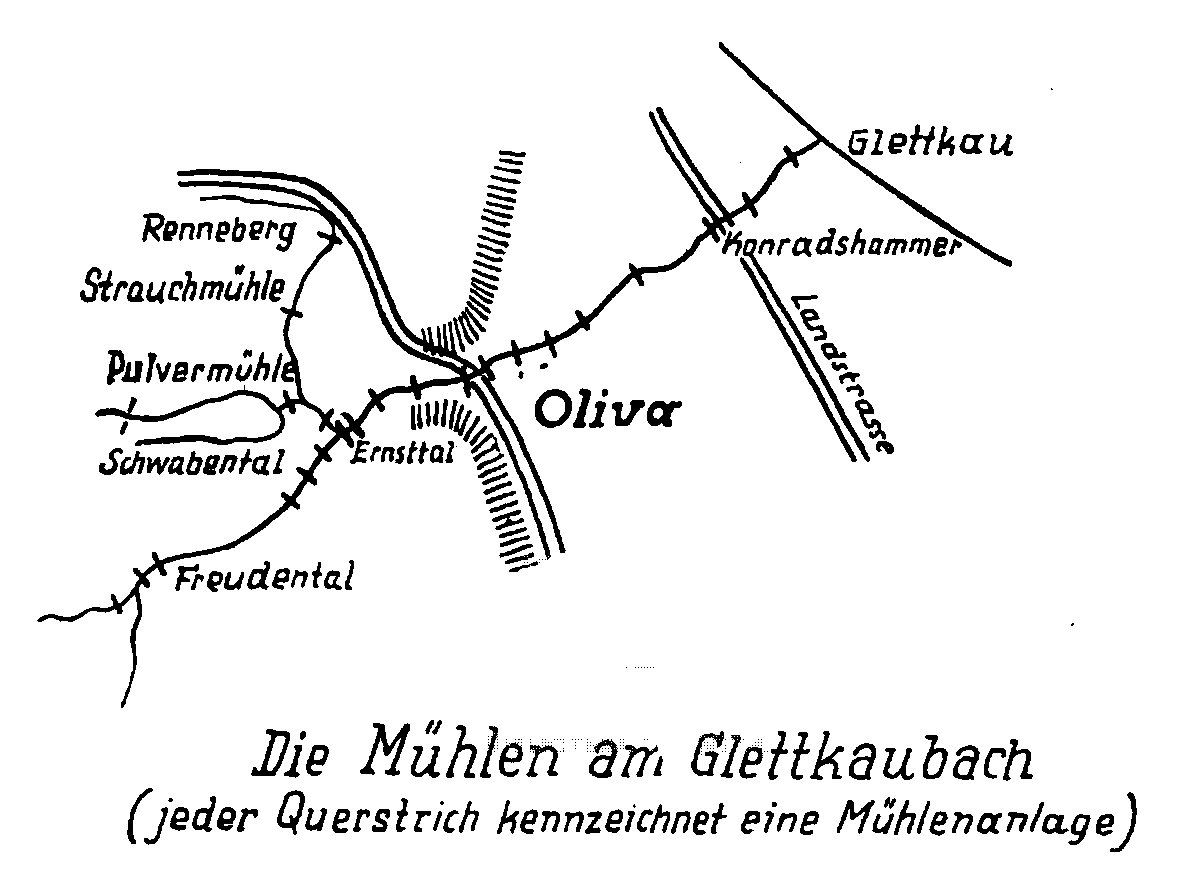"Die Blütezeit Danzigs als Handelsstadt im 16. Jahrhundert hatte die Gründung von zahlreichen Mühlenanlagen am Glettkaubach durch Danziger Kaufleute begünstigt. Der Bach war früher viel wasserreicher als heute, da ihm die Wasserversorgung Danzigs und Olivas noch kein Wasser entzog. Er trieb um 1600 schon eine ununterbrochene Kette von etwa 23 Mühlenwerken, von denen etwa die Hälfte Eisenhämmer waren. Außerdem arbeiteten Pulvermühlen, Säge- und Papiermühlen, Walkmühlen, Loh- und Mahlmühlen und eine Büchsenschmiede. Die Eisenhämmer bezogen aus Schweden Eisen und Alteisen und machten daraus Stangeneisen und allerlei Gerätschaften. Auch die anderen Mühlen lieferten meist für den erheblichen Danziger Bedarf. Im Jahre 1555 waren diese Betriebe sowie die zahlreich dafür herbeigerufenen fremden Arbeiter von Sigismund ll. August in besonderen Schutz genommen worden. Es bestand in Oliva eine eigene Hammerschmiedeinnung, deren Gewerksrolle 1678 vom polnischen Könige und 1679 nach Zufammenschluß mit dem Gewerk der Stahlschmiede auch vom Olivaer Abt bestätigt wurde. Sie umfaßte noch 1879 38 Meister, während die Olivaer Müllerinnung nur 33 Meister zählte.
