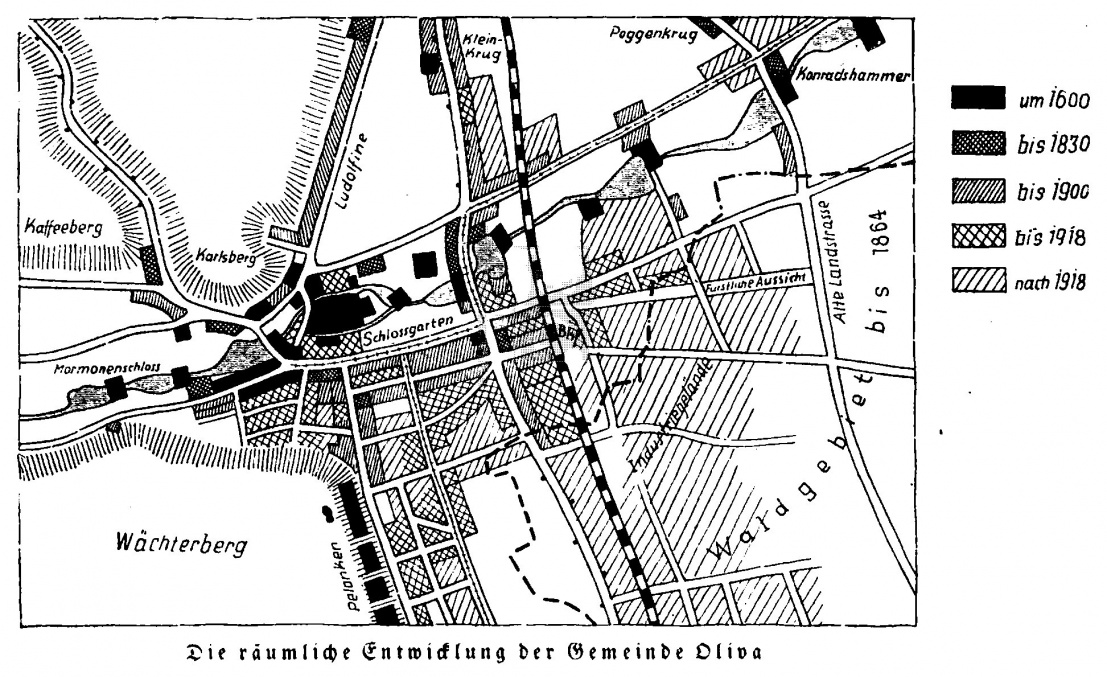 Diese Mühlenwerke, die dem Kloster als Grundherren Zins zahlten, machten Oliva seit etwa 1600 zum Sitz einer blühenden Mühlenindustrie. Der ganze Bachlauf von der Mündung bis fast zu den Quellen war durch Querdämme immer wieder stufenartig gestaut; ein Mühlenteich reihte sich an den andern wie eine blinkende Kette vom Meere bis in die Waldberge; an ihnen lagen die Mühlen und Hämmer mit den dazugehörigen Häuschen der Meister und ihrer Gesellen, wie sie uns heute als Gebäude vielfach erhalten sind. Eine Karte aus dem Jahre 1800 etwa zeigt eine erheblich stärkere Bebauung am Bachlauf, als wir sie heute haben. Der Bachlauf war lange Zeit die Lebensader und die Hauptachse des Ortes; vom Kloster als Keimzelle und Kernstück hatte sich die dörfliche Siedlung bis zum Beginn des 17. Jahrhunderts bachaufwärts und abwärts als ein verhältnismäßig schmales Band ausgestreckt."