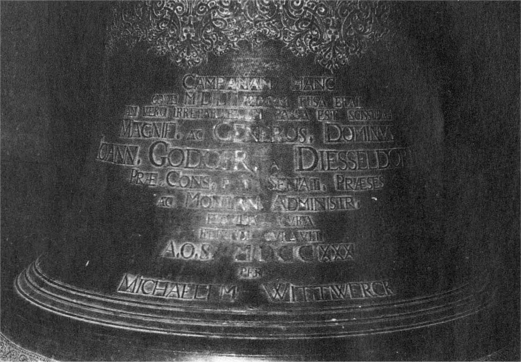 Diese Glocke, die 1551 zum ersten Mal gegossen war , jetzt aber einen unreparierbaren Riß erlitten hat, ließ der hochherzige und edelgesinnte Herr Johann Gottfried von