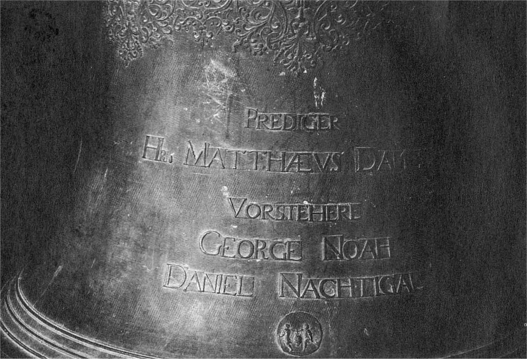 Die Inschrift auf der Rückseite nennt den Namen des Predigers, H. Matthaeus Damitz, und der beiden Kirchenvorsteher, George Noah und Daniel Nachtigal.