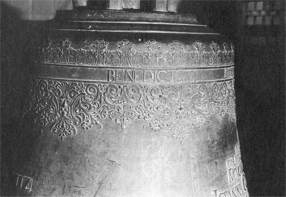 Inschrift geht her vor, daß sie aus einer Vorgängerglocke, von 1551, die gesprungen war, neu gegossen wurde. Im 2. Weltkrieg wurde sie, wie 80.000 andere Glocken, konfisziert und