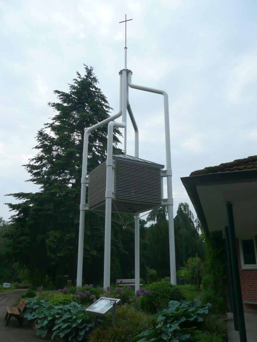 Der Glockenturm zeichnet mit seinen 4 Stahlrohren die Konturen eines möglichen Turmes nach und stellt einen "entmaterialisierten" Umriss dar.