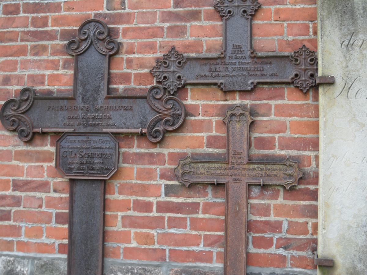 Das erste Foto ist auf der kleinen Terrasse des Lokals aufgenommen, das zu dem Campingplatz gehört, der ebenfalls am See liegt. Die Kirche (leider ist der Turm auf dem Bild 2 "abgeschnitten") liegt ebenfalls direkt am See. Davor meine Schwester und ich (ganz in blau). An der Seitenwand der Kirche finden sich einige alte Grabkreuze, unter anderem das des Pfarrers Wiederhold, des ersten Pfarrers der evangelischen Gemeinde Mariensee. Sein Name ist auch in den alten Kirchenbüchern zu finden.