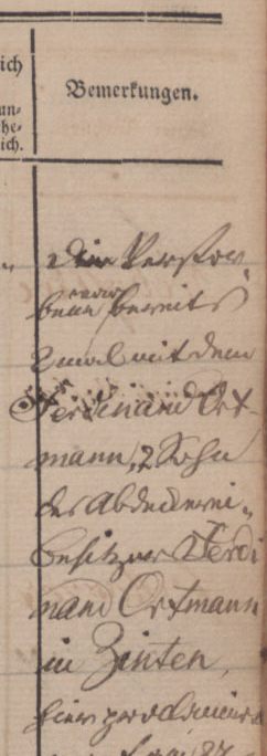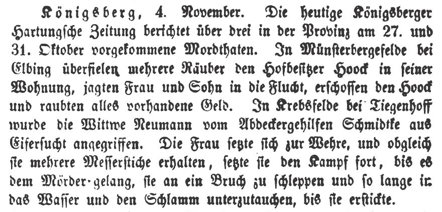 Bemerkung: Die Verstorbene war bereits 2mal mit dem Ferdinand Ortmann, 2. Sohn des Abdeckerei-Besitzers Ferdinand Ortmann in Zinten, hier proclamiert worden, worauf am 27.10. der ehemalige Abdeckerei-Gehülfe Conrad Schmidtke aus Neuenburg in genannter Stunde anscheinend zum Besuche kam, um hierauf zunächst den Bräutigam aus Eifersucht ermorden wollte, der aber entsprang und während dieser Hülfe suchte, ermordete Schmidtke die Verstorbene, indem er behauptete sie habe sich mit ihm bereits eingelassen, und ihm die Ehe versprochen. Als die Hülfe erschien, war die Verstorbene schon getötet, es hatte der Mörder sich auch verwundet, ist aber im Krankenhaus in Elbing geheilt worden.