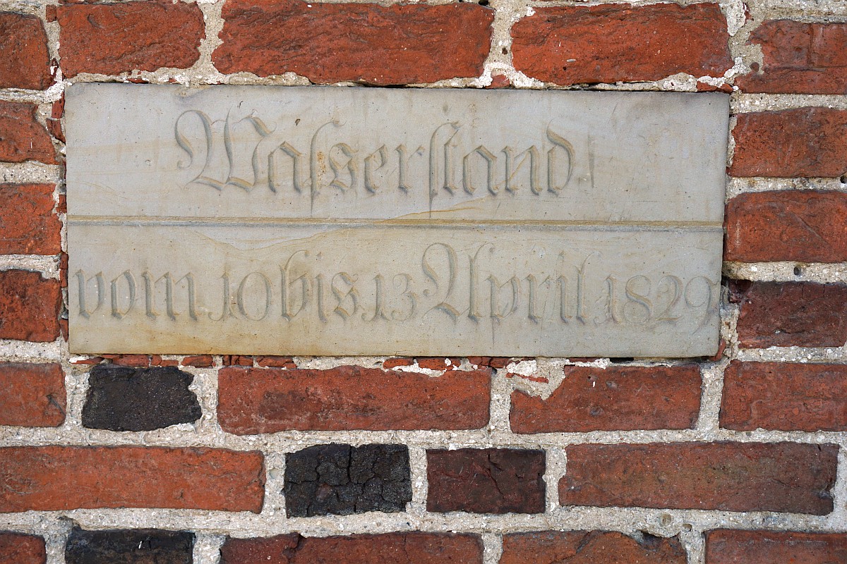 Die Wasserstandsanzeige neben einer Kirchentür bezieht sich auf das verheerende Weichselhochwasser im April 1829 das große Teile der Niederung verheerend heimsuchte.