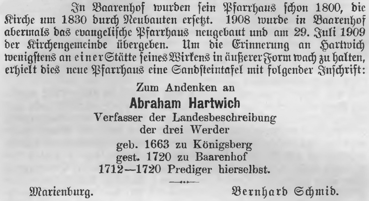 Abraham Hartwich war Pfarrer in Barenhof und einer der berühmtesten Chronisten der Werdergebiete. 1908 wurde in Barenhof an der Stelle an der sein Pfarrhaus stand, ein neues Pfarrhaus gebaut und an der Fassade eine Gedenktafel angebracht.