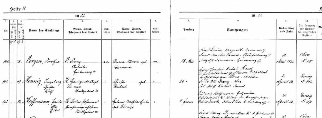 eigentlich gibt es mit den Buchstaben K und R kein Verhören, wie es früher wohl häufig passiert ist. Nein, die Urkunden kenne ich noch nicht. Vielen vielen Dank. Zuerst hatte man über diese Familie keine Infos, jetzt fast geballt :-). Jetzt fehlt mir hauptsächlich noch die Heiratsurkunde von Hans Waldemar Hennig, geb. 5.7.1891 in Danzig-Stadtgebiet und Christa Anna Margot Kubert oder Rubert, geb. am 4.1.1900 in Danzig. Spaß beiseite. Ich suche noch. Die Zeit des Datenschutzes müsste hierfür schon vorbei sein. Ich gehe davon aus, dass sie ca. 1919 geheiratet haben, da eine Tochter 1920 geboren wurde. Die andere 2 Jahre später. Die Mutter war zu dem Zeitpunkt ja selbst noch sehr jung, also sicherlich vorher nicht bereits ein Kind.