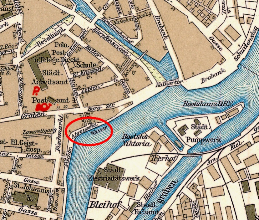 Das von mir bezeichnete Grundstück Burggasse/ Ambrausenden Wasser war im Besitz des Ehepaares Julius Heinrich Krämer *12.09.1824, gest. 17.12.1903 (beide Male Danzig) und Juliane Renate Vorstoff *15.04.1825, gest.22.02.1012 beide Male Danzig. Sie waren die Eltern meiner Uurgroßmutter Elisabeth Johanna Krämer, *28.02.1854, gest.23.12.1924 beides in Danzig. Sie war verheiratet mit Anton August Eycke geb. 11.08.1847 in Neustadt/Westpreussen, gest.11.03.1936 in Danzig. Das habe ich aus dem mir von meinem Vater hinterlassenen Stammbaumaufzeichnungen. Unter Anton Eycke und von seinen Söhnen löste sich der Besitz dann auf. Wann genauwas von wem erworben und wieder verkauft wurde, wollte ich immer mal bei "metricki" nachsehen- habs aber immer noch nicht klar gefunden. Lieber Peter, vielen Dank auch für Deine Mühe !! Hilde