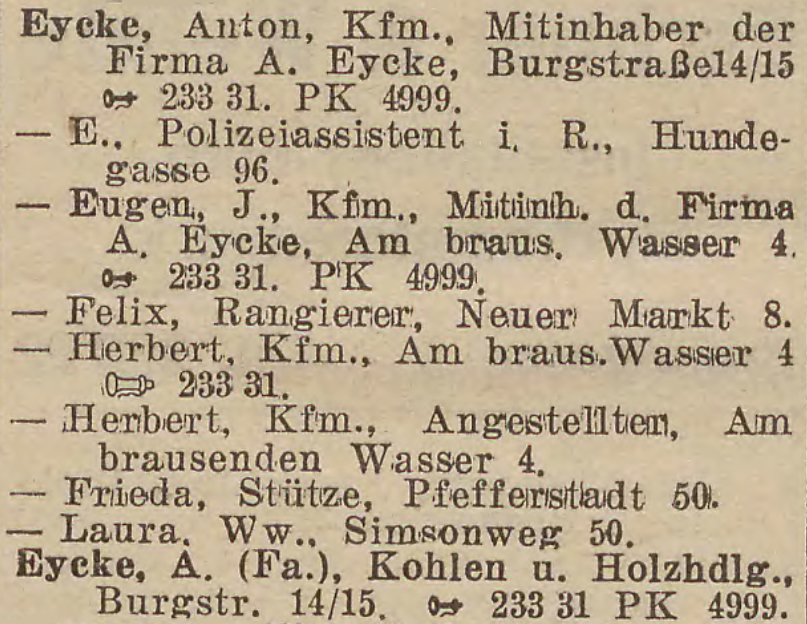 • Im IV. Teil Bezugsquellen-Verzeichnis unter "Kohlen, 3. Einzelhandel": "A. Eycke (Fa.), Hundegasse 112". Die Nachprüfung im II. Teil Straßen-Verzeichnis zeigt jedoch beim Eintrag "Hundegasse 112" keine entsprechende Angabe.
