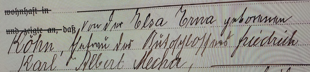 ich kann mal wieder ein Wort nicht lesen, die Phantasie reicht auch nicht dazu. Dabei ist der Satz ansonsten gut zu lesen: von der Elsa Erna geborenen Köhn, Ehefrau des ............................... Friedrich Karl Albert Mecha