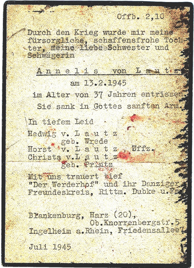 Als ich Anfang September 1945 geboren wurde, war meine Tante, Annelies von Lautz, bereits seit 6 Monaten mit ihrem Fluchtboot, der "Hedwigshütte" am 13. Februar 1945 vor Fehmarn auf eine Miene gelaufen. Meine Tante ist dabei im Meer ertrunken.
