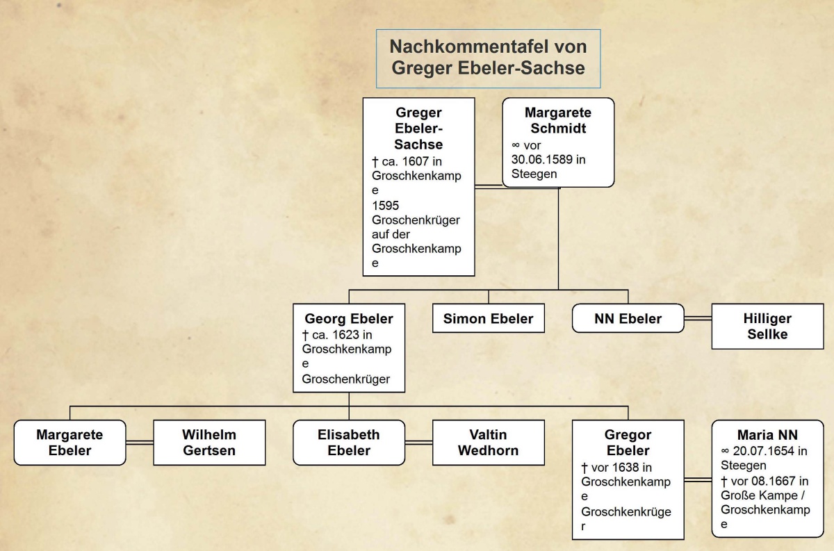 Im Jahre 1638 wird Georg Eggert als Groschkenkrüger bezeichnet. Er hatte Greger Ebelers Witwe geheiratet. Am 13.6.1654 wurde, da zu dieser Zeit Gerge Eggert schon tot war, seiner Witwe Maria der Krug mit Land durch Schicht und Teilung übereignet. Maria Eggert heiratete alsbald Gert Gertsen, dem sie dieses Grundstück am 19.9.1654 zubrachte (8).