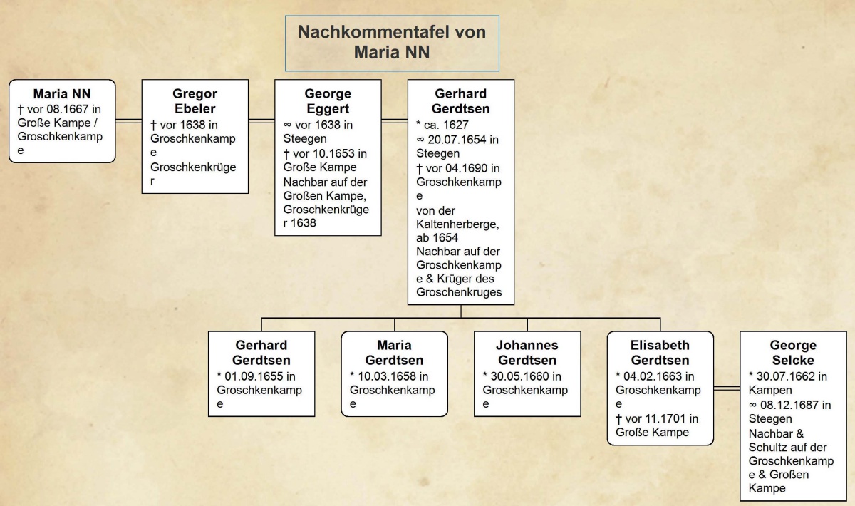 Die Maria NN, Ehefrau von Gregor Ebeler, George Eggert und Gerhard Gerdtsen, den sie lt. Kb als Witwe von George Eggert 1754 heiratet und mit ihm bis 1662 vier Kinder bekommt und vor 08.1667 stirbt --- Gerhard Gerdtsen heiratet in 2. Ehe Anna Neumann: