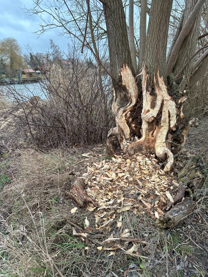 Frische Fraßspuren zeugen von deren Aktivitäten. Zumindest in diesem Abschnitt der Elbinger Weichsel bestehen aus wasserbautechnischer Sicht keine Bedenken gegen die zunehmende Population, aber es ist schon ein Einschnitt in das (Fluss-) Landschaftsbild wenn hier alte Weiden nach und nach verschwinden.