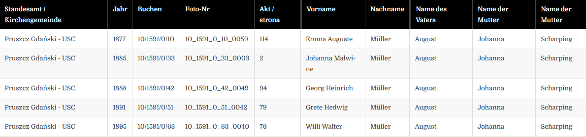 Hallo Herr Kopperpahler, vielen Dank für die Liste aus Praust. Ich habe dort evtl. übereinstimmend einen Namen gefunden meiner Ur-Ur-Großmutter Johanna Müller, mütterlicherseits meines Ur-Großvaters. Vielleicht war sie ja schon Witwe weil ihr Name aufgeführt ist und nicht die meines Ur-Ur-Grossvaters also ihres Mannes. Können sie mir da weiter helfen oder sagen warum das so ist. Habe auch den Stammdaten eintrag gefunden über die Geburt meines Ur-Großvaters Willi-Walter Müller geboren in Praust. Wahrscheinlich war es eine Hausgeburt damals. Vieles ist in Polnischer Sprache was ich natürlich nicht lesen kann. Woher haben sie diese Liste oder können mir sagen wo ich noch mehr über Eintragungen finde über Praust, bzw. preußisch Holland.? Denn da haben meine Ahnen damals einen Hof gehabt bei Mühlhausen- Praust , Landkreis Danzig damals schon oder wieder...