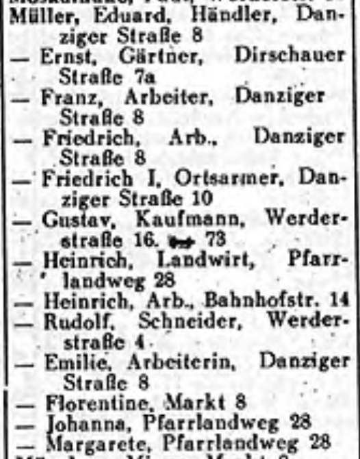 Unter dem Link in Beitrag #18 findet sich eine Web-Seite, die die von mir gepostete pdf-Datei aus Beitrag #16 als Liste (noch mit den original von mir genutzten Trennzeichen) als Text präsentiert. Sie ist eine Abschrift aus dem Adressbuch von 1927/1928.