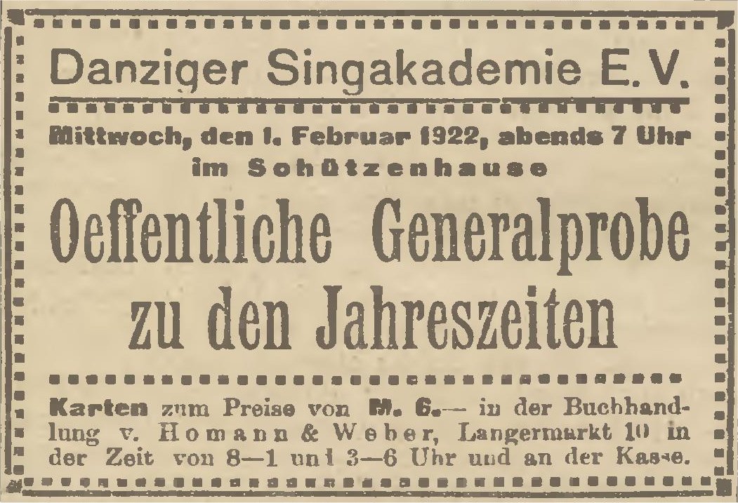 Auch im Jahr 1900 fanden nur zwei Veranstaltungen wieder im Schützenhaus, und zwar am 28. März Max Bruchs Oratorium Odysseus, op. 41 und am 12. Dezember Haydns Oratorium: Die Jahreszeiten statt. Die Solisten waren nicht aus Danzig.