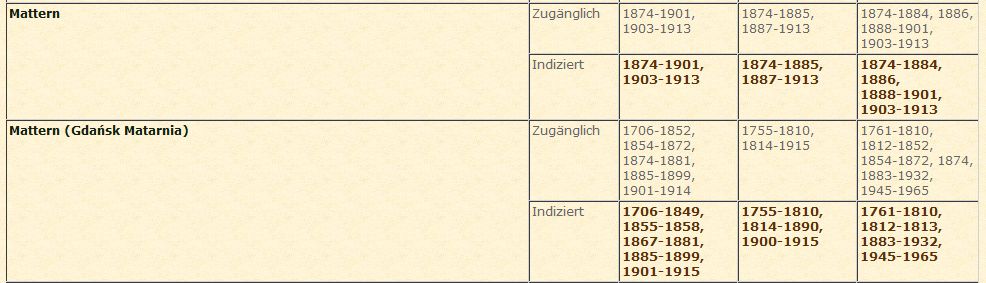 Ich habe heute Mittag im Forum von PTG nach "Matarnia" gesucht, und dann den Post des Mannes gefunden, der die Kirchenbücher von Mattern digitalisiert, bzw eingescannt hat. Habe dann gefragt, wo ich die besagten Kirchenbücher von Mattern finden kann, da ja die Bild-Dateinamen auf PTG angegeben werden.
