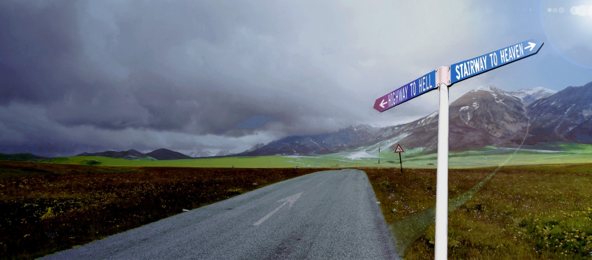 nein ich bin kein Maler, nein, nein. Aber ich würde hier gerne mal eine Grafik von mir einstellen, welche irgendwie dazu passt. Man beachte die breite Einbahnstraße in die Hölle nach links, und den schmalen steinigen Weg ins Licht nach rechts.