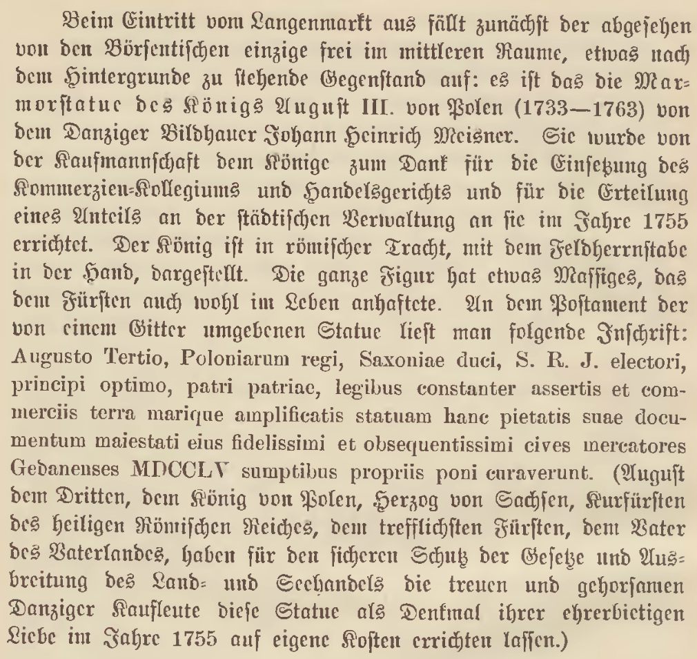 "So wurde am Geburtstag des Königs, der als einziger polnischer König nie in Danzig erschien, ein Denkmal von Johann H. Meissner am Artushof errichtet. Der König erschien darauf als römischer Kaiser, auf dem Sockel stand eine lateinische Inschrift: "Bis August III, König von Polen, Kurfürst des Heiligen Römischen Reiches, der beste Herrscher, Vater des Vaterlandes, wegen der ständigen Bestätigung der Rechte und des Handels an Land und auf See, erweiterte diese Statue als Beweis Ihre Andacht musste 1755 auf eigene Kosten von den treuesten und gehorsamsten Danziger Kaufleuten ausgestellt werden."